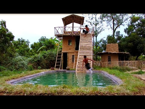 Build Three - Story Villa House And Swimming Pool With Water Slide By Ancient Skills (full video)